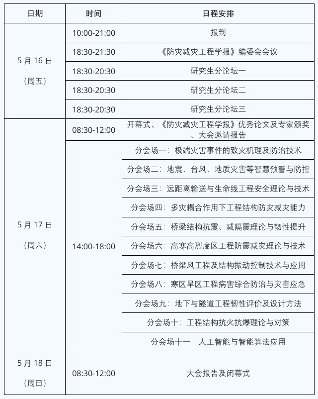 由《防灾减灾工程学报》编委会发起的“全国防灾减灾工程学术会议”始于2011年,已南京(2011)、哈尔滨(2013)、深圳(2015)、武汉(2017)、南宁(2019)、北京(2023)成功举办了六届,是防灾减灾工程领域的高水平学术品牌会议。